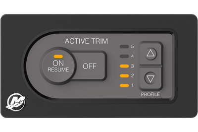 The Active Trim system includes five built-in trim profiles that can be selected based on driver preference. As the boat accelerates, the system automatically trims the engine out. Upon deceleration, like when making a turn, the engine trims in. Auto trim settings can be manually overridden to compensate for changes in boat load, driver preferences and weather conditions.